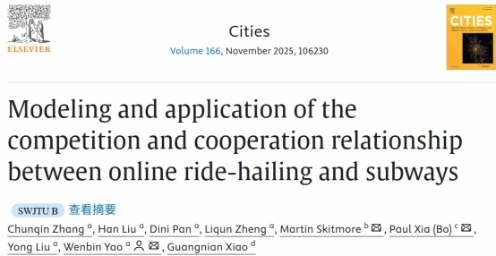 2025年3月,张春勤团队在国际知名期刊《Cities》上发表题为“Modeling and application of the competition and cooperation relationship between online ride-hailing and subways”的文章。该成果第一作者为张春勤副教授,讲师姚文彬为论文的通讯作者,9428cn太阳集团古天乐为论文第一通讯单位。