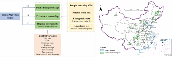 文章旨在检验中国“公交都市”政策的宏观实施效果,基于2009—2018年221座城市的面板数据,采用多期倾向得分匹配—双重差分(PSM-DID)进行因果识别,同时使用沿海城市作为工具变量进行了2SLS端ogeneity检验,并控制了竞争政策(低碳城市)的影响。结果显示,该项目显著提升了公共交通使用,但对私家车保有量的影响不显著。研究通过最近邻匹配提升样本可比性,平衡性与平行趋势检验良好;在虚假时点与置换安慰剂检验下结论稳健。异质性方面,东部地区公共交通使用提升显著,中西部地区不显著;各区域对私车拥有量的影响均不显著。总体而言,“公交都市”项目有效推动公共交通优先与绿色出行,但难以抑制私家车保有,政策层面宜叠加拥堵费、限号或停车约束等等政策手段以形成协同效应。该工作为优化城市交通结构与低碳治理提供了实证支撑。