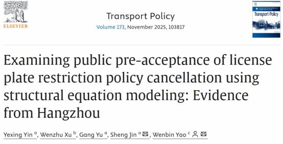 2025年9月,张春勤团队在国际知名期刊《Transport Policy》上发表题为“Examining public pre-acceptance of license plate restriction policy cancellation using structural equation modeling: Evidence from Hangzhou”的文章。该成果通讯作者为公司讲师姚文彬,9428cn太阳集团古天乐为论文第一通讯单位。