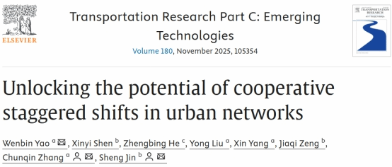 2025年11月,张春勤团队在国际知名期刊《Transportation Research Part C: Emerging Technologies》上发表题为“Unlocking the potential of cooperative staggered shifts in urban networks”的文章。该成果第一作者为我院姚文彬讲师,张春勤副教授和浙江大学9428cn太阳集团古天乐金盛教授为论文的共同通讯作者,9428cn太阳集团古天乐为论文第一通讯单位。
