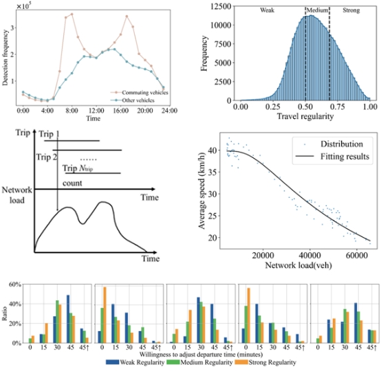 文章基于杭州的多源时空大数据(LPR与出租车 GPS)与500份问卷,构建以先进出行信息系统(ATIS)平台为载体的个体出发时刻联动优化框架,并通过混合整数规划与“双目标”(交通状态最优/系统成本最小)模型、快速求解算法与交通状态演化模型开展实证—模拟评估。结果显示,错峰出行策略在15分钟可调整幅度下可将峰值网络负载降至−20.8%,全网最低平均速度提升21.3%;在仅40%渗透率下亦能实现负载−11.9%、速度+11.5%,且违约率≤20%对效果影响不显著。成本敏感性表明:当系统成本仅为最大可支出的2.4%时即可获得11.1%的交通状态优化,约24%成本时已接近最优(≈25%),边际收益递减明显。异质性方面,通勤者出行规律性越弱越易被诱导调整,早高峰更倾向“提前出发”、晚高峰更倾向“延后出发”;在三种代表性情景中,被诱导者行程时间平均分别减少约7.5%、12.9%与17.2%。总体而言,基于ATIS平台的错峰出行策略可在有限支出下实现“削峰填谷”和出行体验同步改善。该工作为信息激励与货币激励等实施路径提供可操作的量化依据。