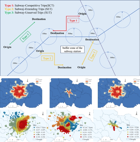 文章旨在刻画网约车地铁系统的竞争—协同关系与其建成环境机理。基于成都2016年4个工作日(周一/三/五/日)的滴滴出行88万条轨迹与兴趣点数据,按照网约车起终点与地铁站缓冲区(0.5 km 半径、0.8 km 可接受步行)关系,将出行划分为地铁竞争(SCT)、地铁延伸(SET)与地铁不可达(SUT)三类;在1,427 个100×100 m网格上,构建基于OLS—GWR—MGWR方法的联合比较框架,评估多尺度空间异质性。结果显示,三类出行占比分别为SUT 48.80%、SET 43.93%、SCT 7.27%,表明地铁网络未臻完善阶段,网约车以补充地铁为主;建成环境方面,购物服务、景点与公交站密度对三类出行均呈显著正向影响;SUT更受居住与医疗服务影响;SCT受住宿、娱乐与企业集聚带动;SET对住宿、企业与景点更敏感。尺度分析进一步揭示变量作用范围差异显著。总体而言,面向商业与景区应强化公交—地铁—网约车衔接与联程票务,在企业高密与地铁覆盖薄弱区布设接驳、补点运力,在住宿集聚区提供游客公共交通导引与班线接驳。该研究为多模式一体化与交通导向发展精准施策提供了量化依据。