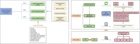 文章旨在检验中国“公交都市”政策的微观实施效果,开展了一项以微信平台为载体、历时13天、面向北京、上海等政策试点城市居民的信息干预实验,并使用倾向得分匹配—双重差分(PSM-DID)方法进行因果识别。结果显示,信息干预同时提升了公众出行态度、政策响应度与政策支持度。研究共获得有效样本 386 份,通过半径匹配改善组间可比性;平衡性检验良好。稳健性方面,无论改用其他方法还是缩尾处理,显著性均保持一致。异质性上,性别差异不显著,而高学历人群对信息干预的响应程度更强。总体而言,面向居民的分次信息推送能有效提升居民对公交都市政策的理解与支持,并引导更绿色的出行倾向。该工作为交通治理中的公众沟通与政策设计提供了实证依据。