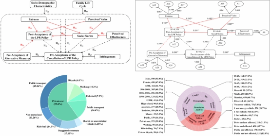 文章旨在评估杭州居民对取消汽车尾号限行(LPR)政策的“预接受度”,基于958份问卷构建了“工具性评价—规范/关系感知—前瞻性接受”的分层框架,采用PLS-SEM方法解析心理作用路径,并以有序Logit模型考察性别、家庭生命周期、通勤时长与车辆拥有等属性的影响。结果显示:对替代措施的可接受度与对政策的“侵扰感”显著提升取消意愿,而社会规范与对现行政策的事后接受度则抑制取消意愿;公平性、有效性与价值感不直接驱动取消意愿,但通过提高社会规范与事后接受度产生间接效应。稳健性方面,公共方法偏差与多重共线性诊断良好,并开展多群组分析。异质性上,男性、年轻/高学历者及有子女家庭更倾向支持取消;通勤≤30/15分钟者与拥有两台燃油车的家庭更不支持,车辆更少者更支持。总体而言,公众对“撤销限行”的态度更多取决于对替代方案的信心与对限制性的主观感受,而非对既有政策绩效的回顾性评价;面向家庭照护与通勤负担的差异化安排、同步扩充多模式替代供给并加强透明沟通。该工作有助于在退出阶段维持公平与信任与社会稳定。