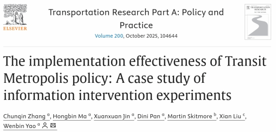 2025年10月,张春勤团队在国际知名期刊《Transportation Research Part A: Policy and Practice》上发表题为“The implementation effectiveness of Transit Metropolis policy: a case study of information intervention experiments”的文章。该成果第一作者为张春勤副教授,姚文彬讲师为论文通讯作者,9428cn太阳集团古天乐为论文第一通讯单位。