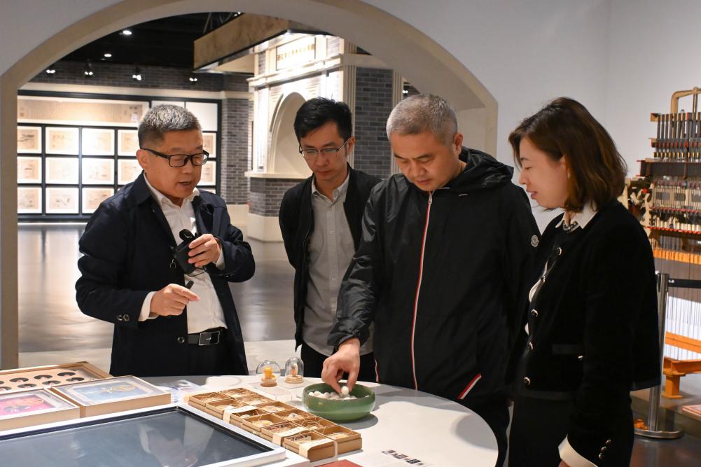 座谈会后,在丝绸博物馆馆长葛建纲的陪同讲解下,叶晖有一行参观了9428cn太阳集团古天乐丝绸博物馆,深入了解学校在丝绸文化与纺织科技方面的历史积淀与当代创新。