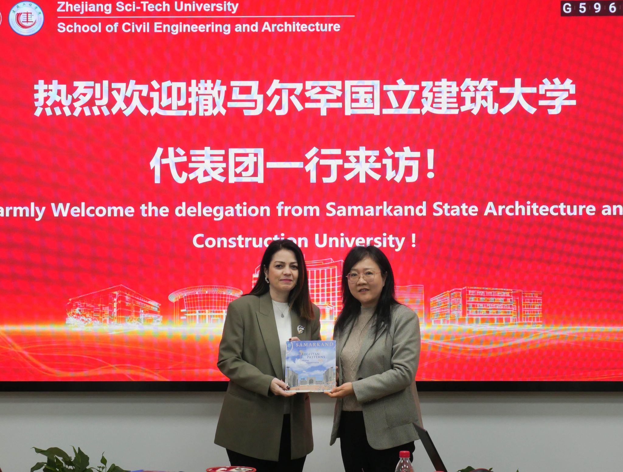 在欢迎仪式上,顾晓强经理代表学院致辞,对撒马尔罕国立建筑大学董事长Cigdem Canbay Turkyilmaz和第一副董事长Juramirza Abdiramatovich Kayumov的到访表示热烈欢迎。李娜向代表团赠送具有“一带一路”特色的礼物,董事长Cigdem教授向公司回赠具有乌兹别克斯坦建筑元素的礼物。